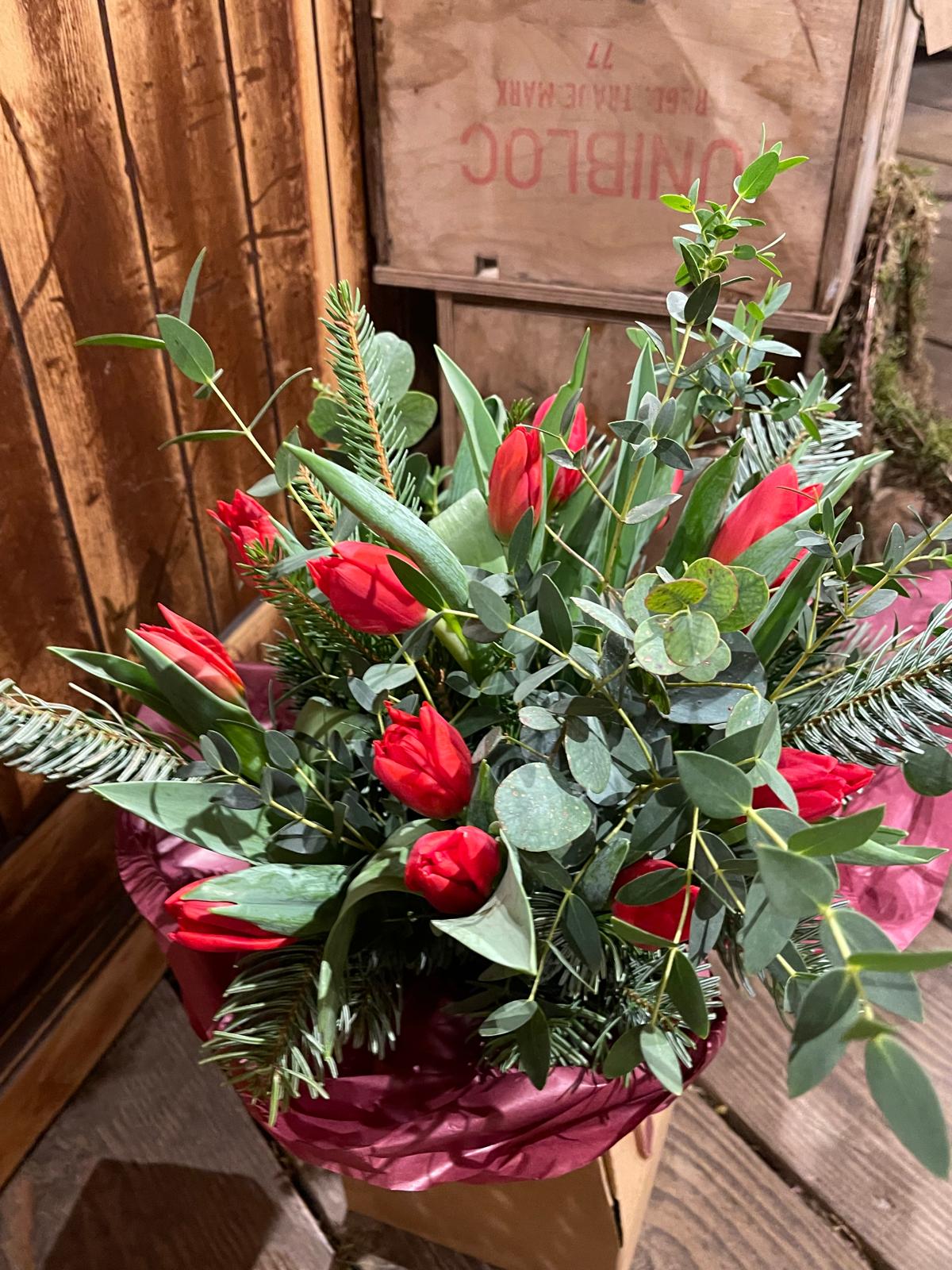 Understated elegance in bloom. This hand-gathered bouquet features British-grown tulips in season, complemented by soft filler flowers and seasonal foliage. Tulips take centre stage, bringing natural beauty and refinement to your Valentine’s gift.